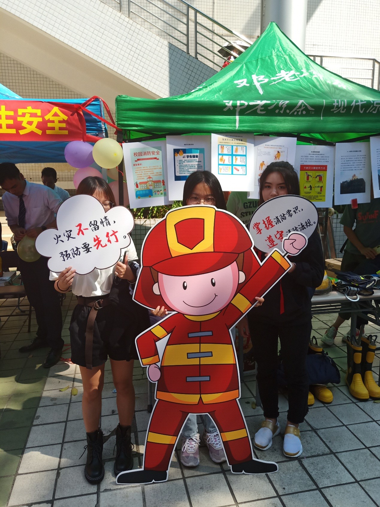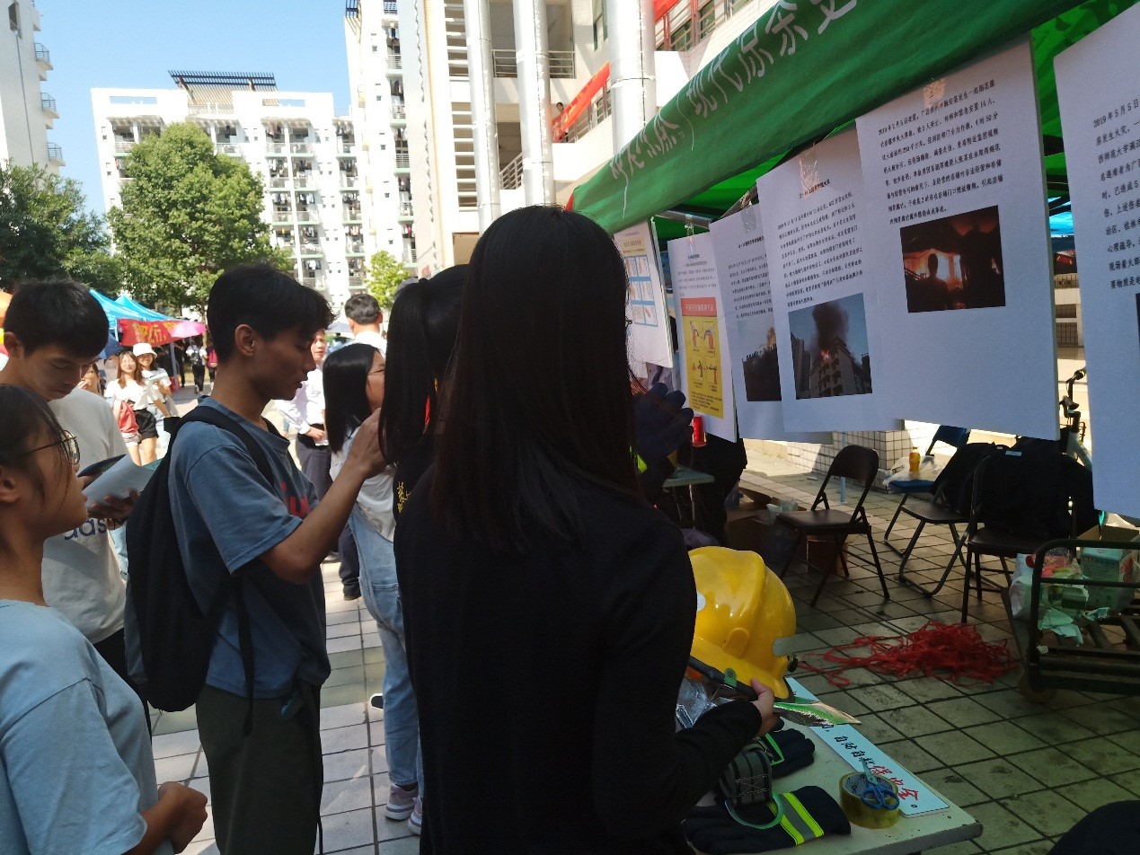 “校园宿舍用电安全规章”通过展示校园宿舍用电安全规章,让同学们对宿舍用电的“可为”与“不可为”有更清晰的认识,给同学们防范校园火灾实践提供理论指导。“重大火灾事故”例举了近年来发生的两例重大火灾事故,两例火灾事故不仅造成了巨大的经济损失,而且造成程度不一的人员伤亡。客观的事故叙述搭配事故现场图片,让同学们认识到火灾的无情及其带来的惨烈后果,并树立了危机意识。“高校宿舍安全事故”选取了近年来三例重大火灾,精简的文字叙述配上事故现场的图片,旨在让同学们加强校园防火意识,在思想上有所提防,在实践中有所防范。“消防事故逃生步骤和灭火器使用步骤”以图片搭配简短文字说明的形式展示了泡沫灭火器、干粉灭火器和二氧化碳灭火器的使用方法,图文并茂有助于同学们掌握灭火器的使用方法。在消防事故逃生方面,采取生动的流程图展示逃生基本步骤,让同学们面对灾情时能冷静处理,安全逃生。此外,活动还展示了灭火器、防毒面具、消防帽、消防服、应急灯和消防靴等实物,搭配消防卡通人物和消防安全标语增强宣传效果。同学们积极阅读消防宣传资料,并通过接触消防器械进一步了解消防安全。